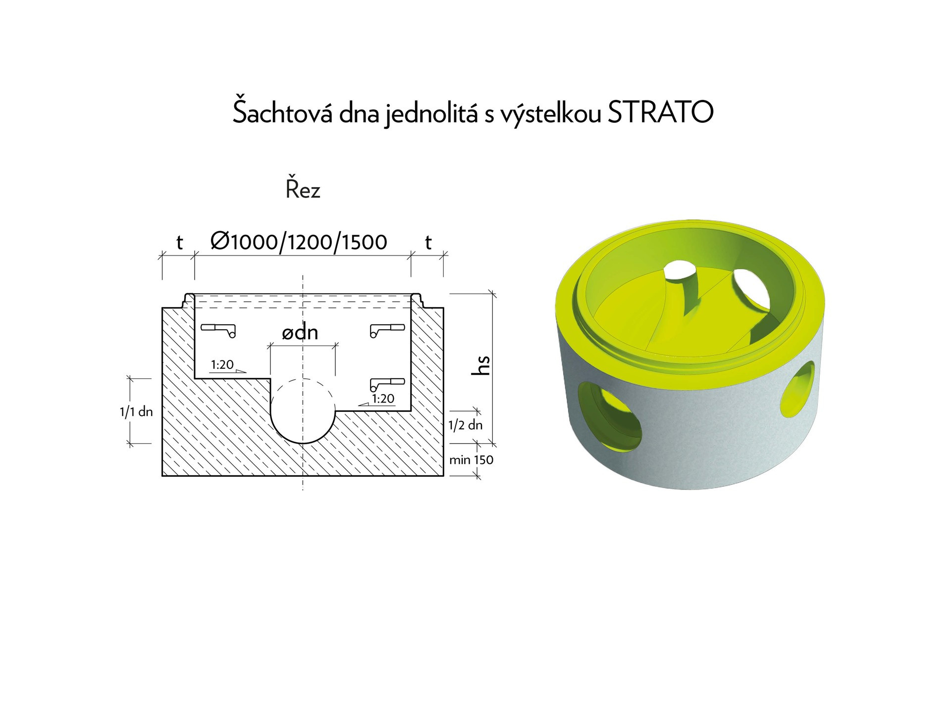 Technologie STRATO je dostupná pro celý šachtový program DN 1000 / 1200 / 1500, tedy pro šachtová dna, skruže (hs 250, 500, 1000), přechodové desky a kónusy.