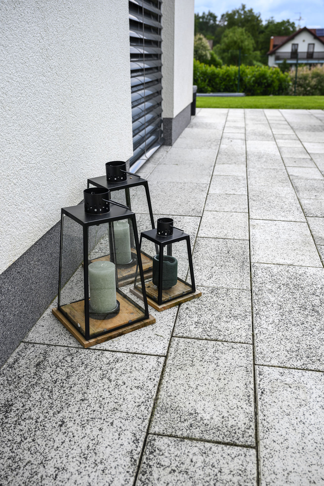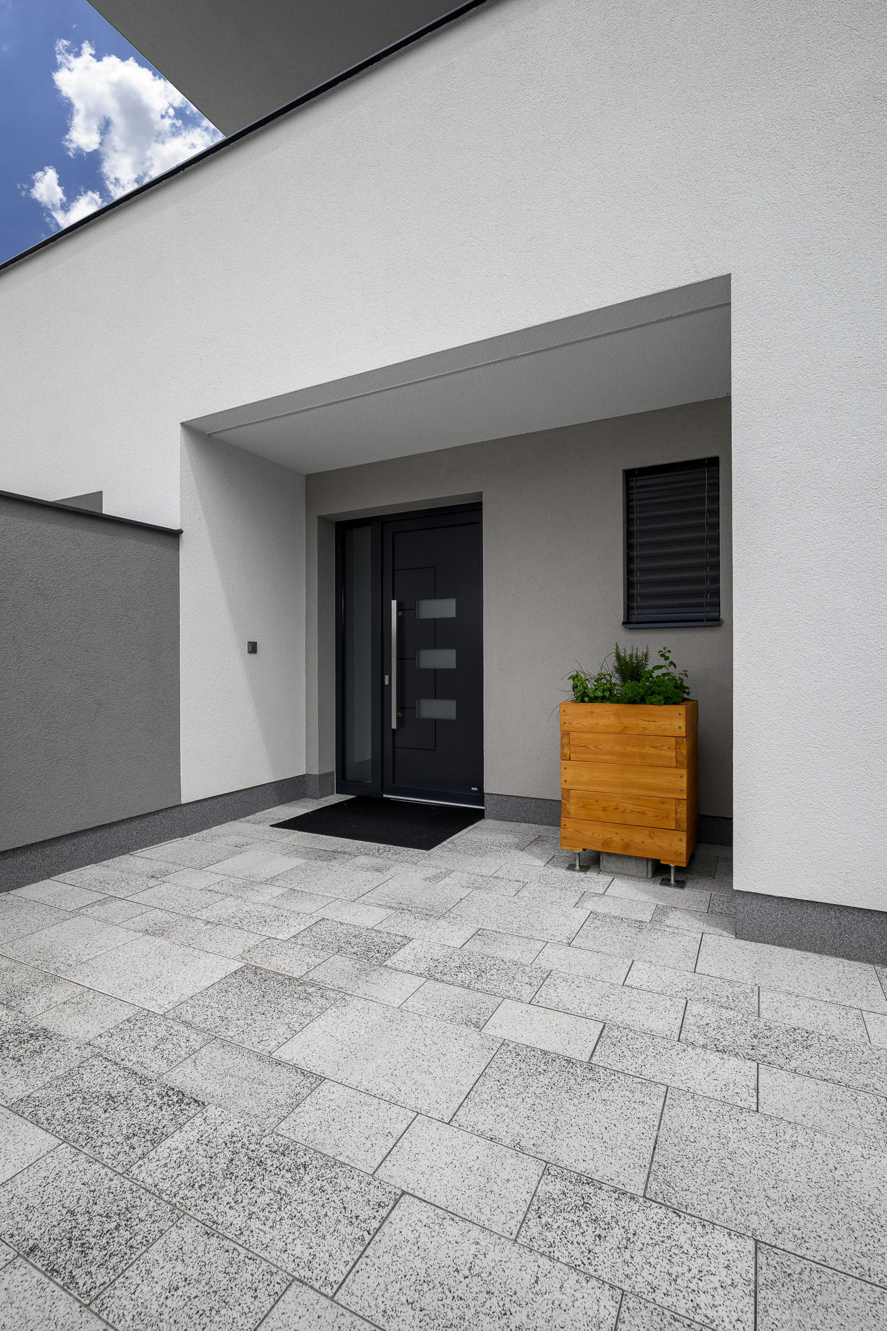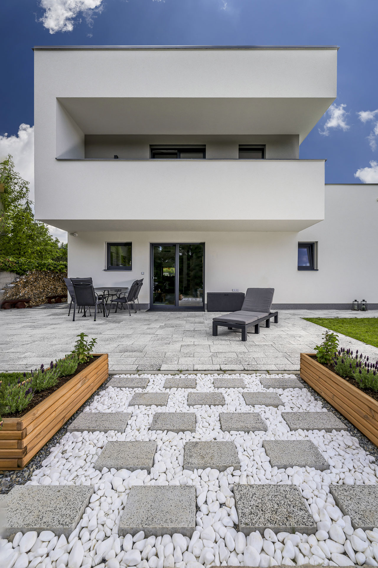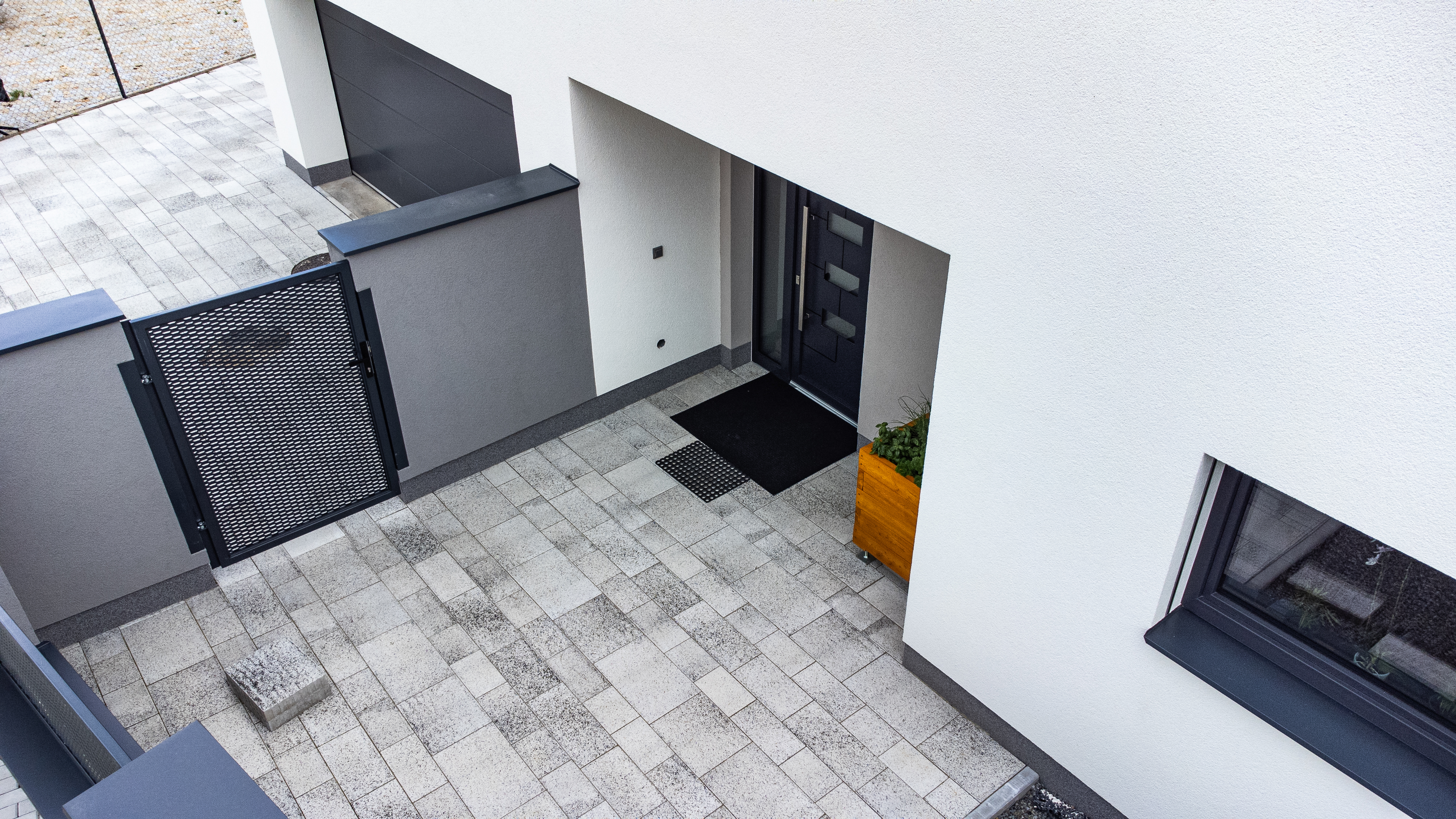 Této navýsost moderní realizaci dominuje dlažba GRAN TECH, jejíž bílo-černá kombinace podtrhuje a skvěle doplňuje styl domu v bílé a antracitové barvě. Díky skladbě ze sedmi kamenů různých velikostí vytváří GRAN TECH nevšední a poutavou plochu, kterou není třeba čímkoli doplňovat či ozvláštňovat.