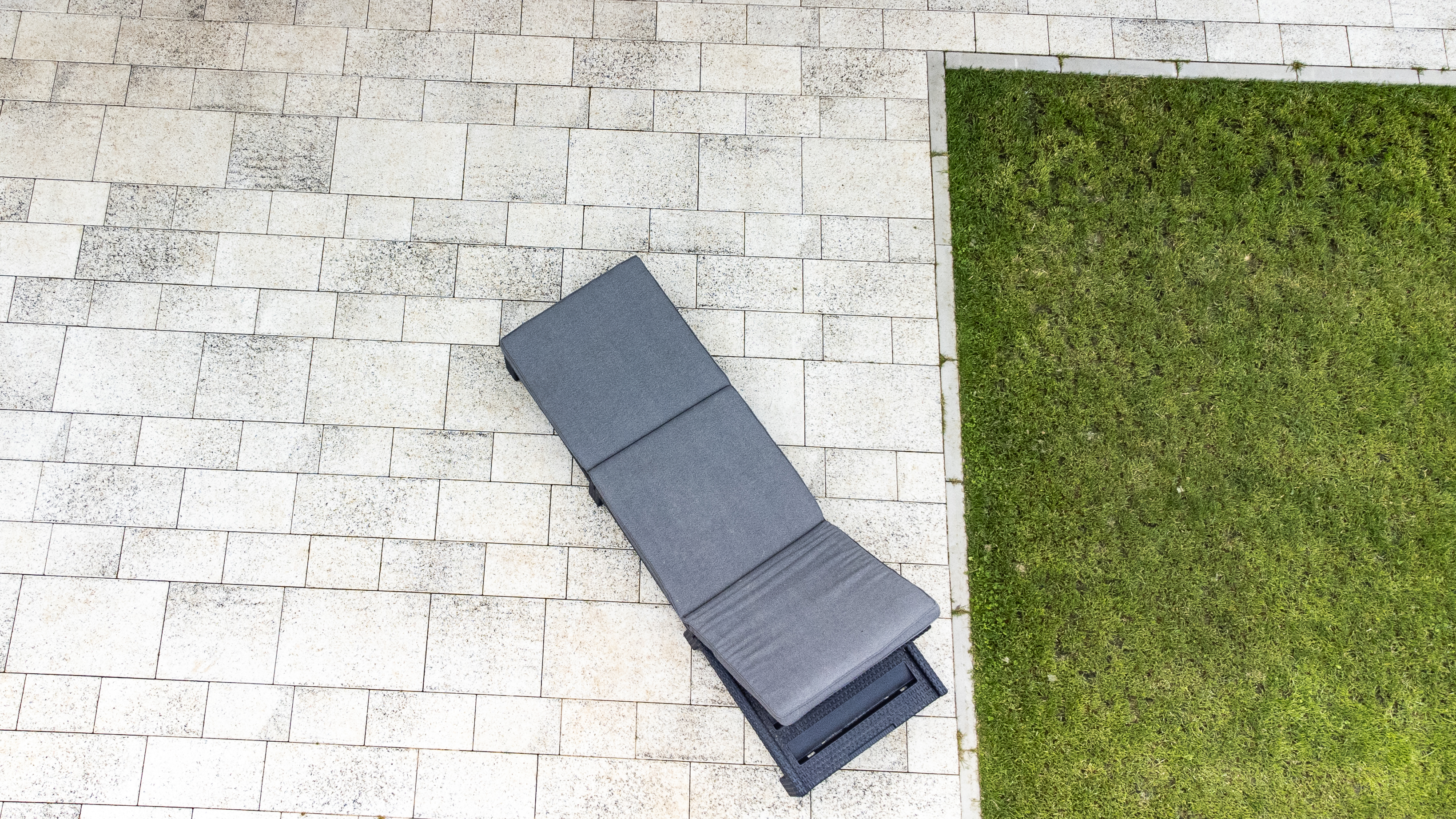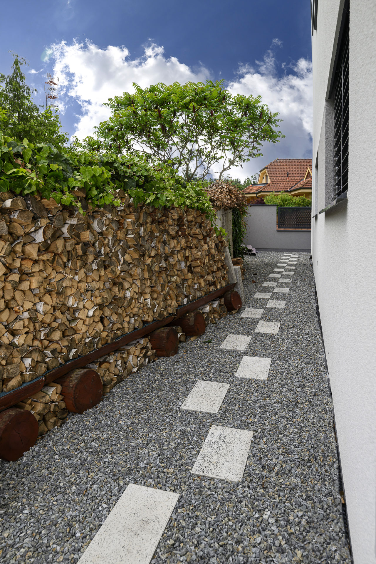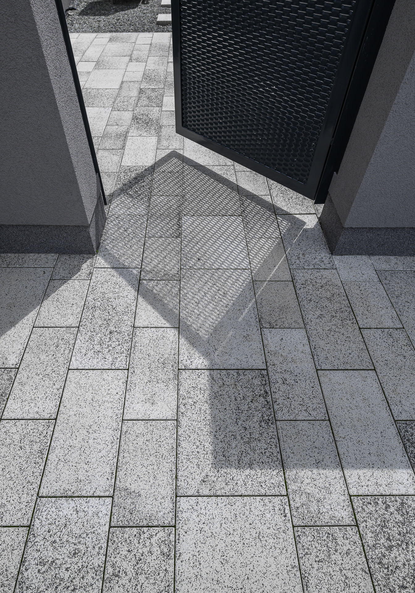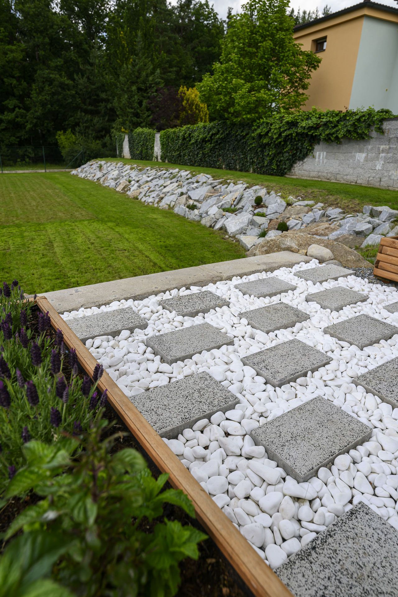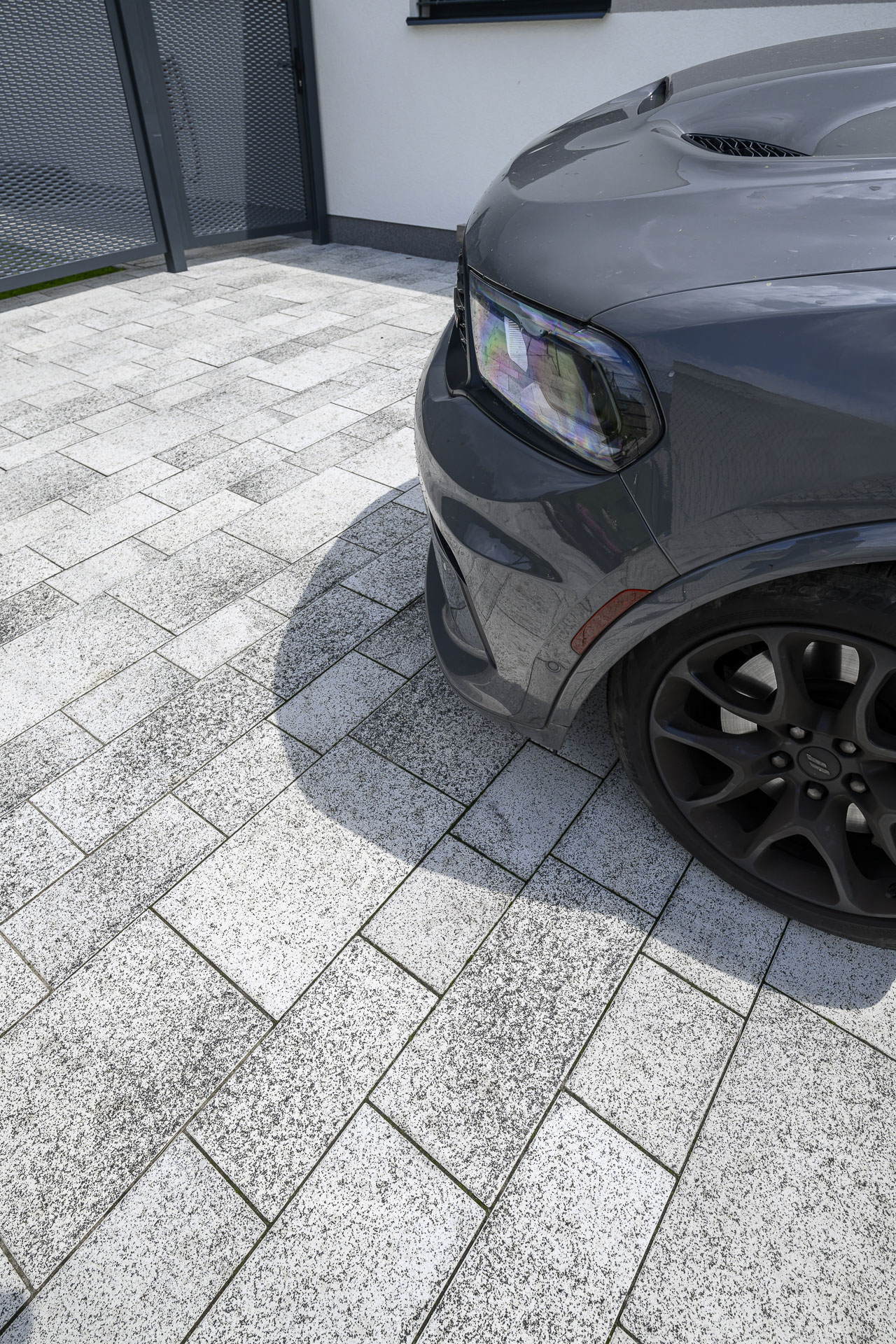 Této navýsost moderní realizaci dominuje dlažba GRAN TECH, jejíž bílo-černá kombinace podtrhuje a skvěle doplňuje styl domu v bílé a antracitové barvě. Díky skladbě ze sedmi kamenů různých velikostí vytváří GRAN TECH nevšední a poutavou plochu, kterou není třeba čímkoli doplňovat či ozvláštňovat.