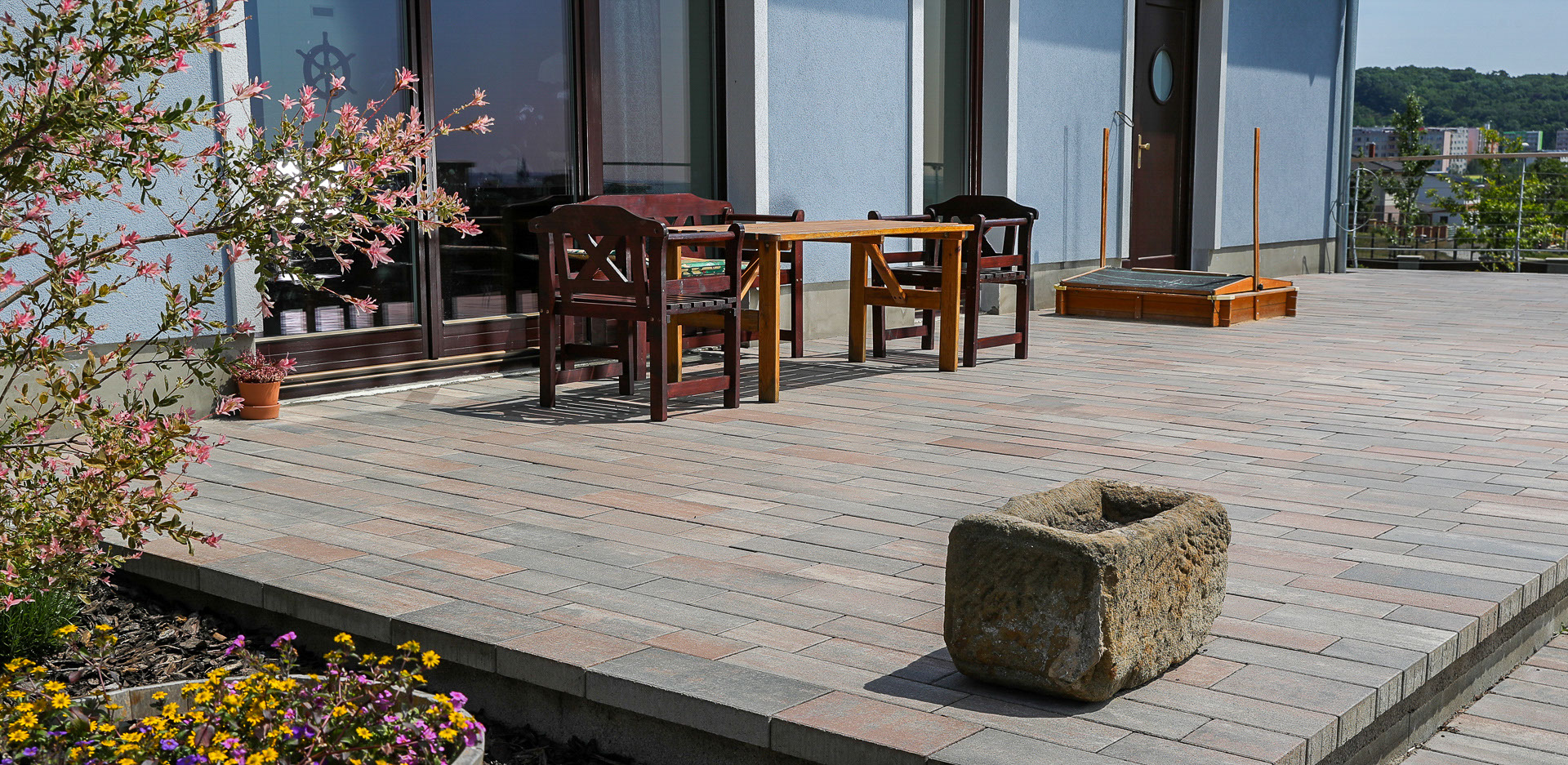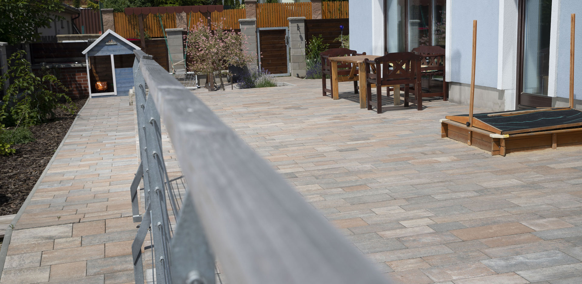 Terasa v barvě CORAL v kombinaci s modrou fasádou působí velmi lehce. CSB - VALENCIA nabízíme ve dvou variantách. Varianta s hladkým povrchem působí lehkým moderním dojmem, naopak dlažba s reliéfním ostařeným povrchem působí dojmem rustikálním. Obě varianty jsou opatřeny povrchovou úpravou CLEAN PROTECT PLUS, která zajišťuje ochranu betonové dlažby proti znečištění.