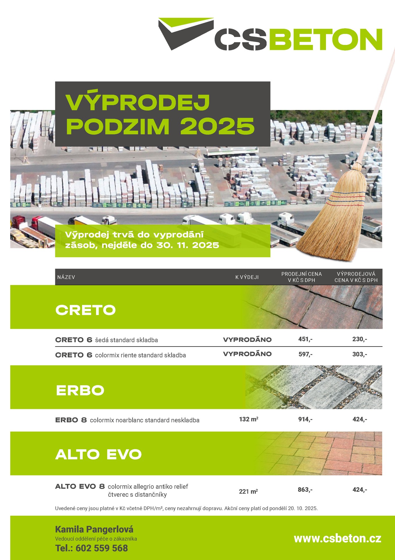 připravili jsme pro Vás speciální podnikovou nabídku pro podzimní sezonu 2025. Aktuálně nabízíme vybranou dlažbu z naší nabídky za akční ceny. V případě zájmu o objednávku či bližší informace neváhejte kontaktovat vedoucí odd. péče o zákazníka Kamilu Pangerlovou na tel. 602 559 568, nebo e-mailu kamila.pangerlova@csbeton.cz.