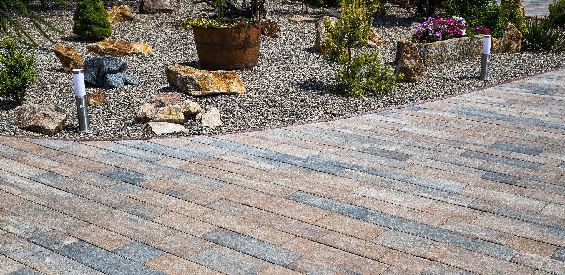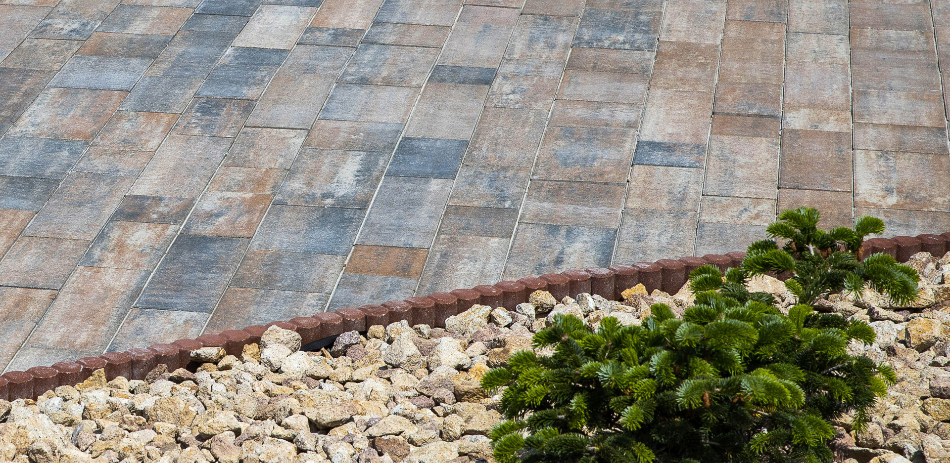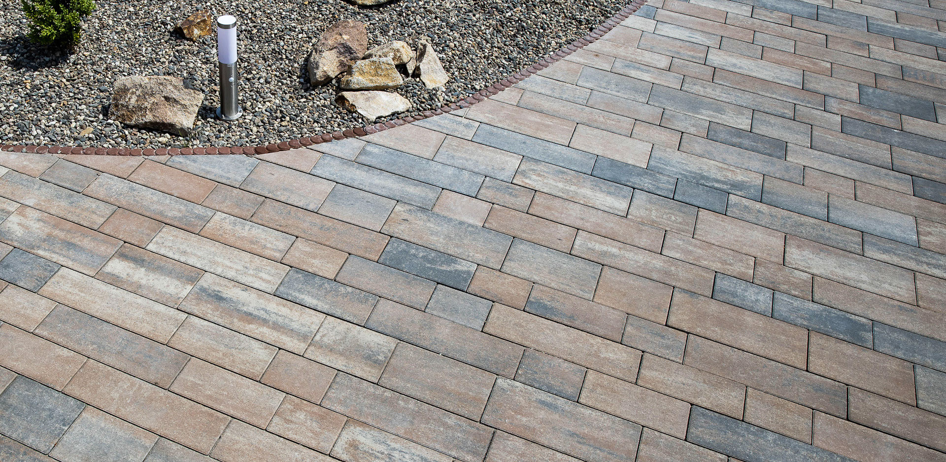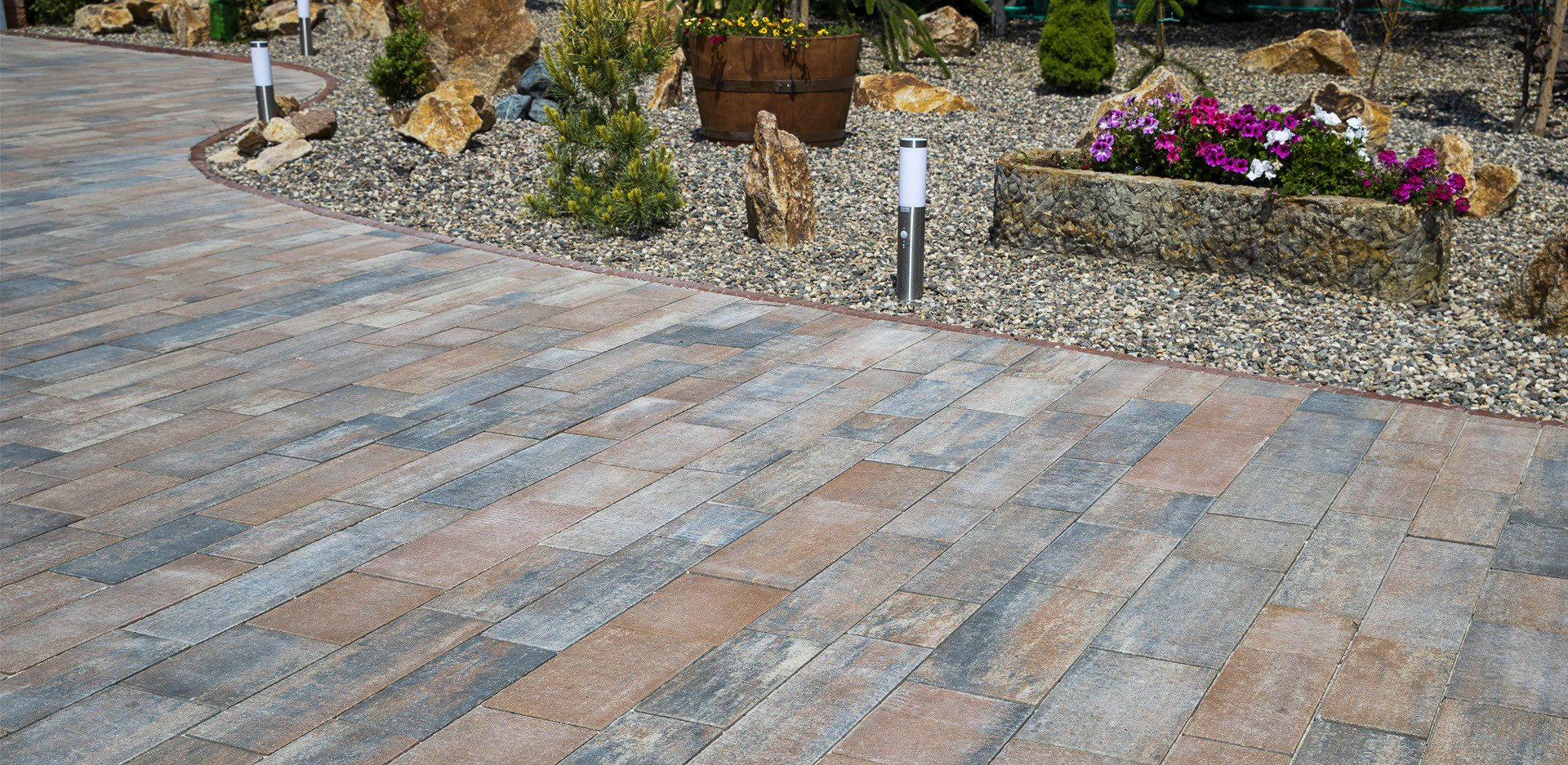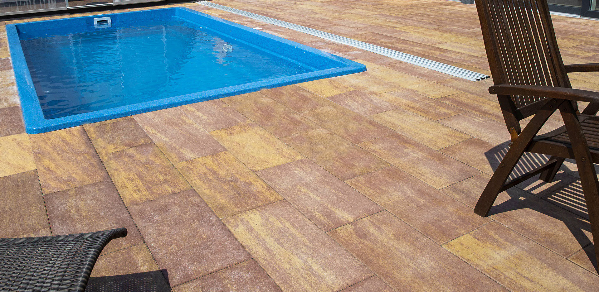 Okolí domu jako je příjezdová cesta se dá tvořit mnoha způsoby. U této realizace je na příjezdovou použita dlažba VALENCIA v barvě CORAL. Tato betonová dlažba, která se skládá z šesti kamenů obdélníkového tvaru různých rozměrů má moderní výraz. U bazénu je použita dlažba LEGANTO v barvě ALBA, což je velkoplošná dlaždice s elegantním podélným tvarem s hladkým povrchem.
