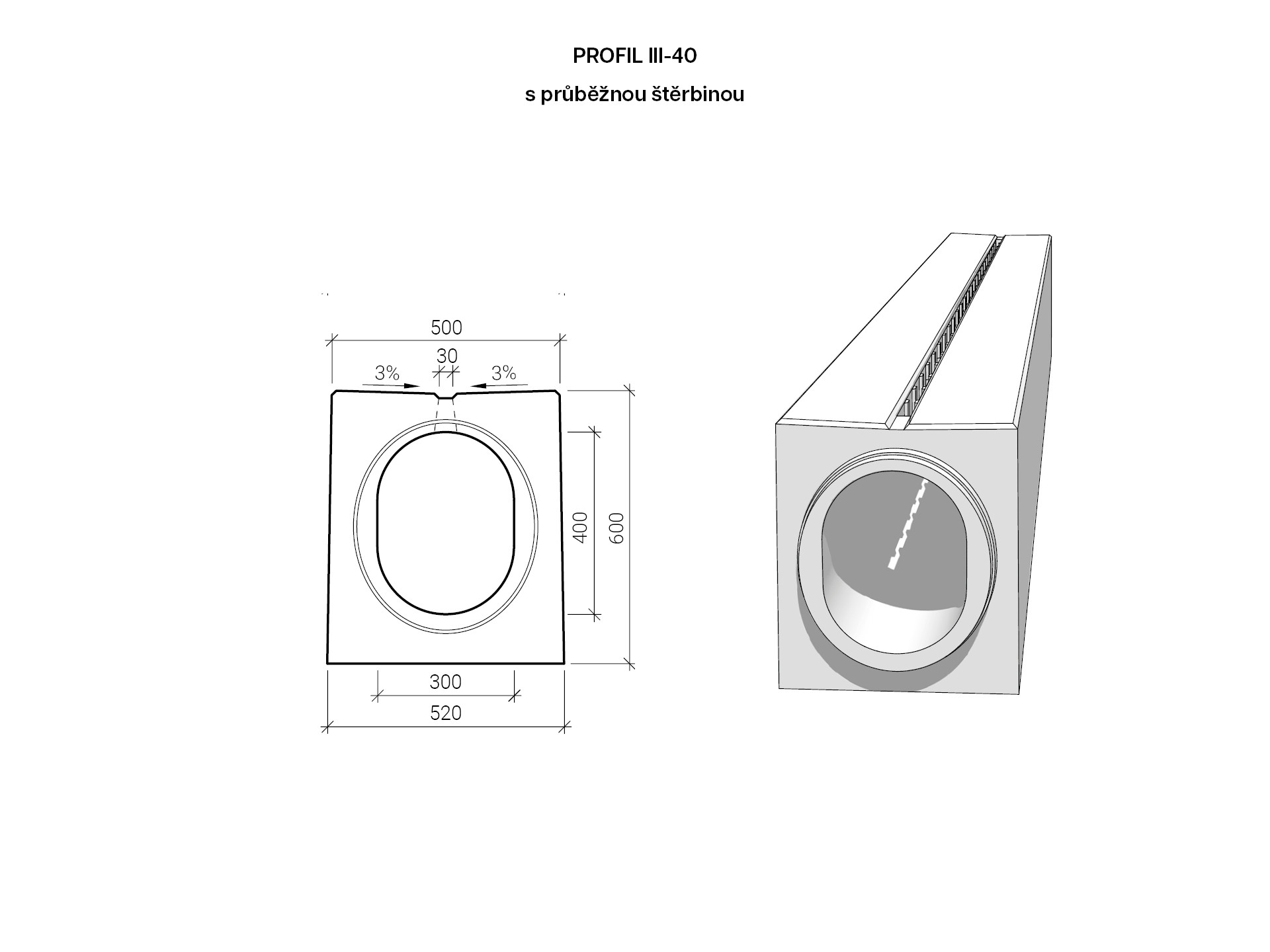 Profil III-40 s průběžnou štěrbinou vyrábíme pouze v provedení bez spádu dna. Tyto prvky jsou dimenzovány pro třídu dopravního zatížení...