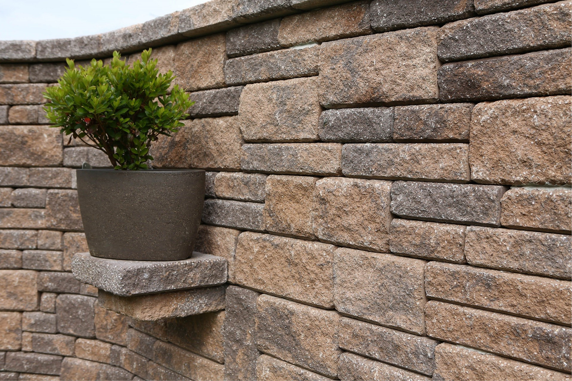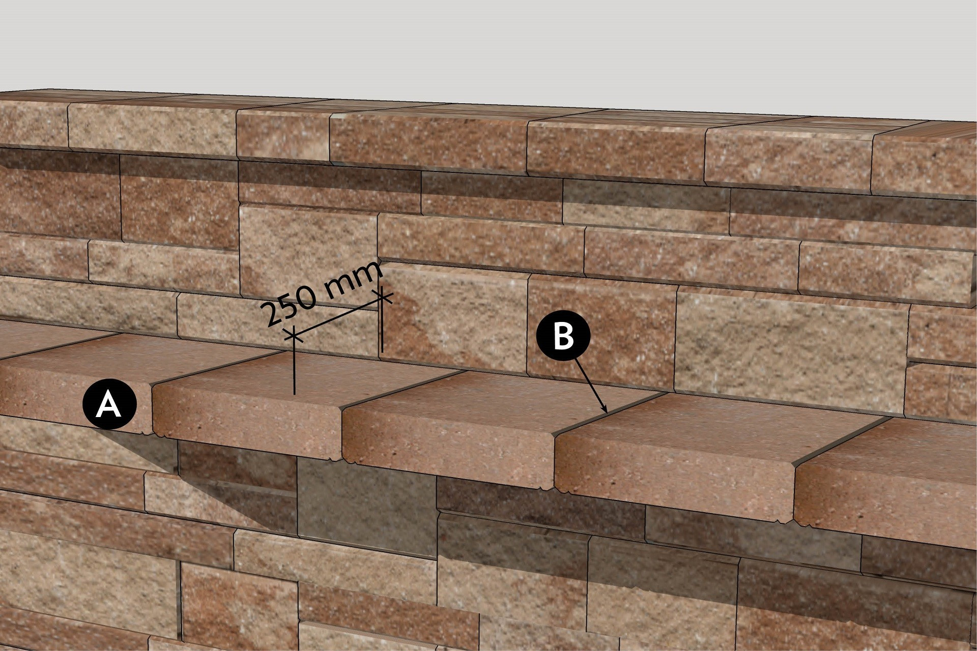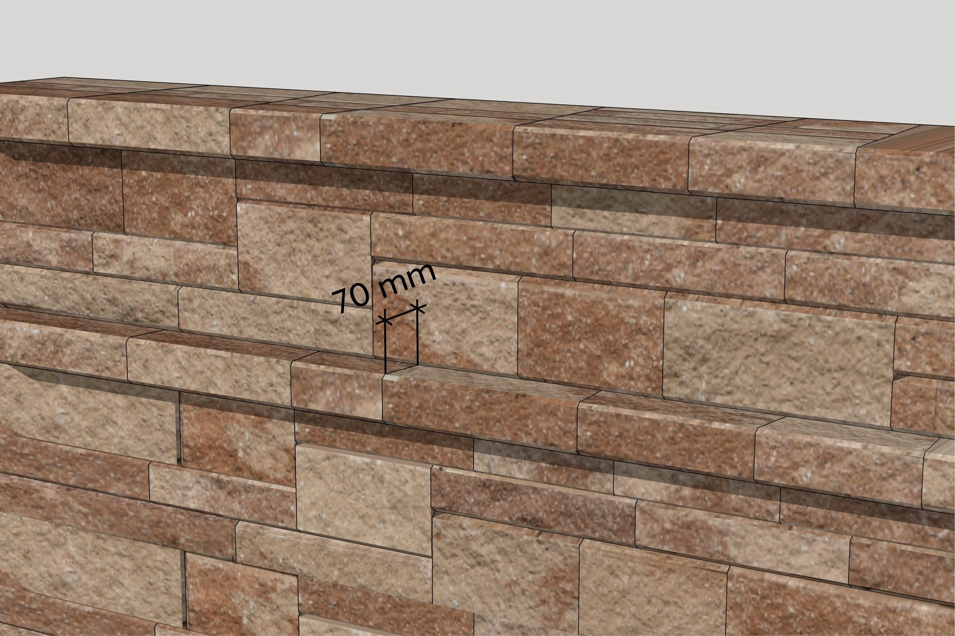 Protože výška stříšek je shodná s výškou nižšího kamene tohoto systemu, jde to jednoduše, aniž by to narušilo přirozenost stavby, integrovat do zdi. Můžeme pro to využít stříšky, které byly použity na zákryt zdi. Jsou to CSB – NATURBLOK stříška – skladba 5 kamenů. S jejich pomocí vytvoříte poličku s malou hloubkou (zhruba 7 cm), kterou je možné použít např. na kořenky nebo jiné drobné předměty. Můžete to vidět na modelovém obrázku č. 8. V případě, že by vám vyhovovala polička hlubší, nemožné to není. Druhý typ stříšek systému CSB – NATURBLOK má stříšku rovnou a jeden z jejích kamenů je dlouhý 50 cm. Pokud ho vložíte kolmo do zdi, můžete s jeho pomocí vytvořit poličku hlubokou až 25 cm (dle potřeby je možné upravit délku seříznutím). Simulaci můžete vidět na modelovém obrázku č. 9.