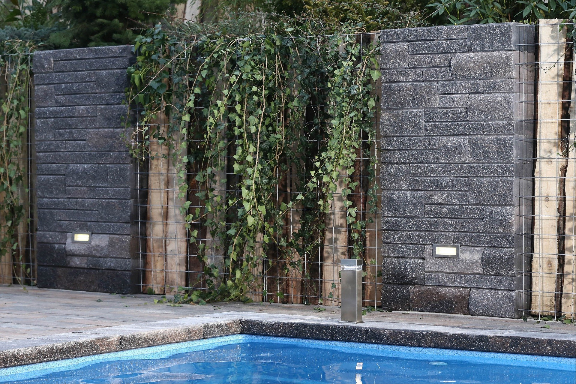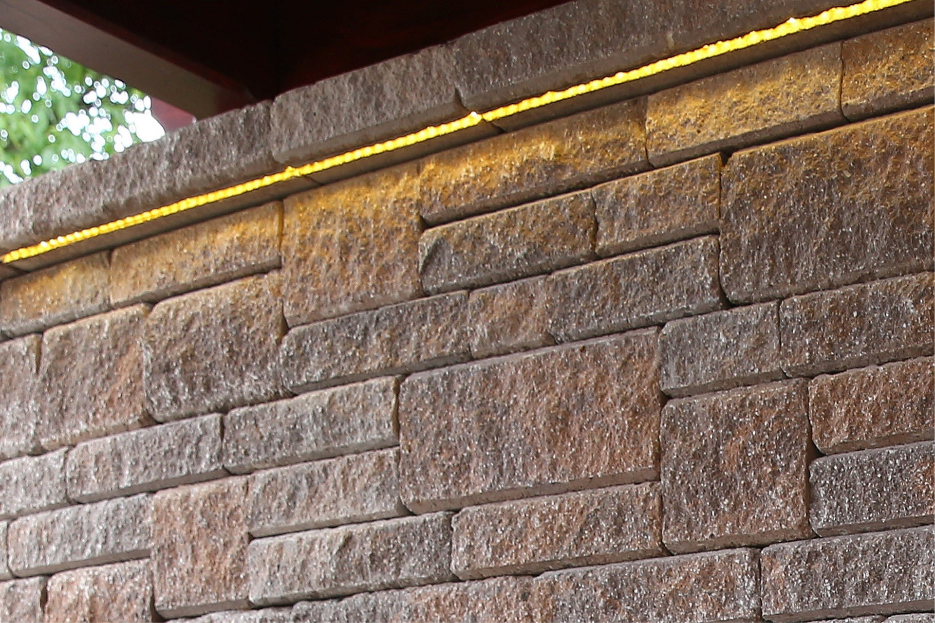 Na zákryt zdí nebo podezdívek používáme stříšku, která je vždy od stěny mírně odsazena. V našem případě je to CSB – NATURBLOK stříška – skladba 5 kamenů. Toto odsazení lze skvěle využít pro vložení LEDkového pásku. Jejich profily totiž mají různou podobu. Jsou předsazené, rohové, otočné, ale i integrované. Pokud chcete vkládat pásek bez profilu přímo do stříšky, můžete pomocí vodní pily vyřezat do spodní strany stříšky drážku v požadované hloubce i šířce, a pomocí silikonového lepidla ji upevnit přímo do drážky. Následný rozvod kabelů je v případě CSB – NATURBLOK EDIT velmi jednoduchý díky dutinám, ve kterých lze kabely v chráničce vést libovolně podle potřeby. Kameny na chráničku pouze navlékáme.