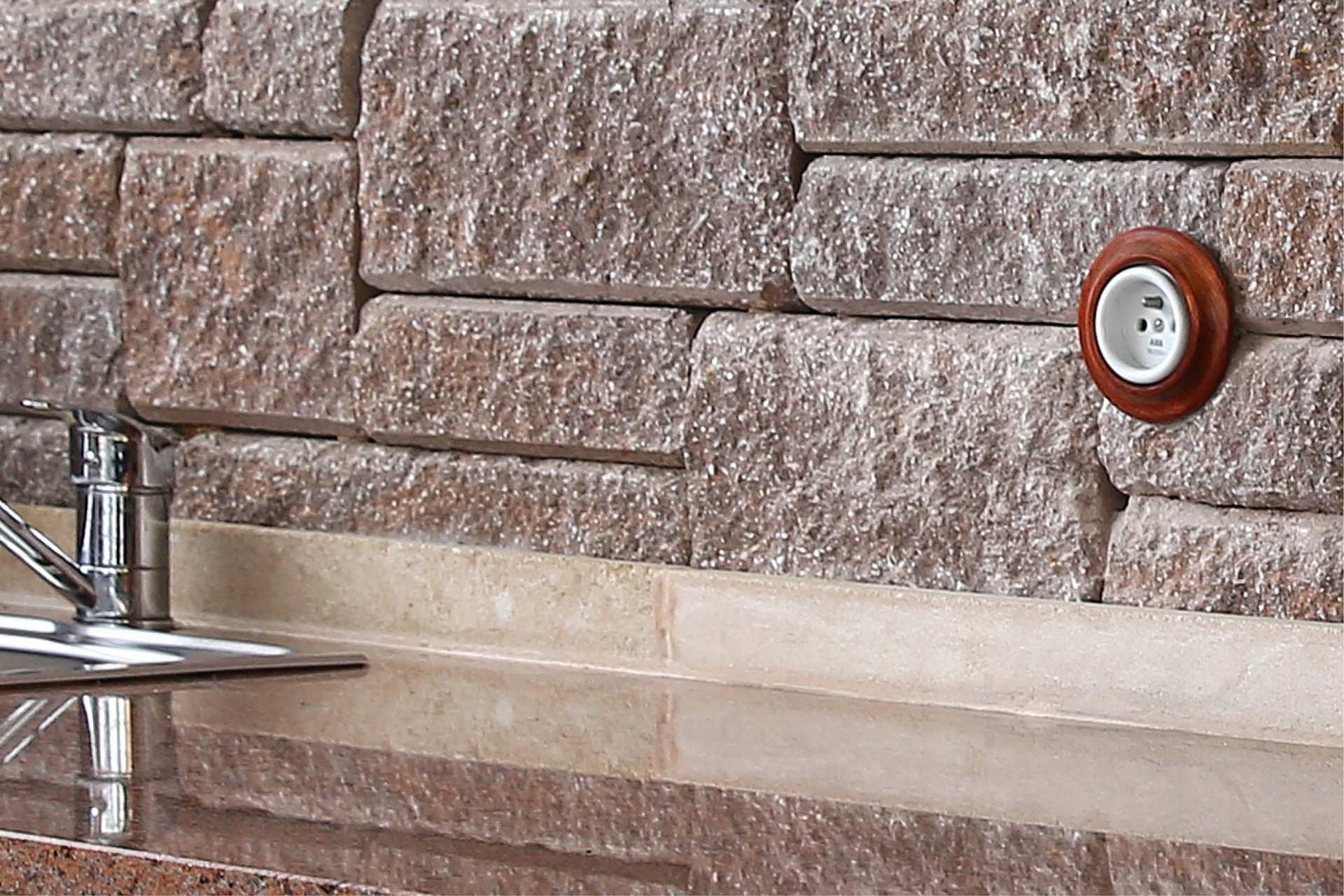 V případě zásuvek a vypínačů můžete použít diamantový korunkový vrták (vykružovák) pro elektroinstalace, kterým na vnitřní krabičku zásuvky, vypínače či svítidla vytvoříte na pohledové straně kamene otvor. Pokud nemáte k dispozici vykružovák, je také možné vybrat místo, kde bude umístěn kámen o výšce 75 mm, a vyříznout do něj otvor flexou. Většina standardních vypínačů a zásuvek, vyjma pár atypických, mají spolu s krytem větší výšku než tento kámen. Proto případně nepřesný či nehezký řez krytem přikryjete. Vedení kabelů řešíme stejně jako u svítidel.