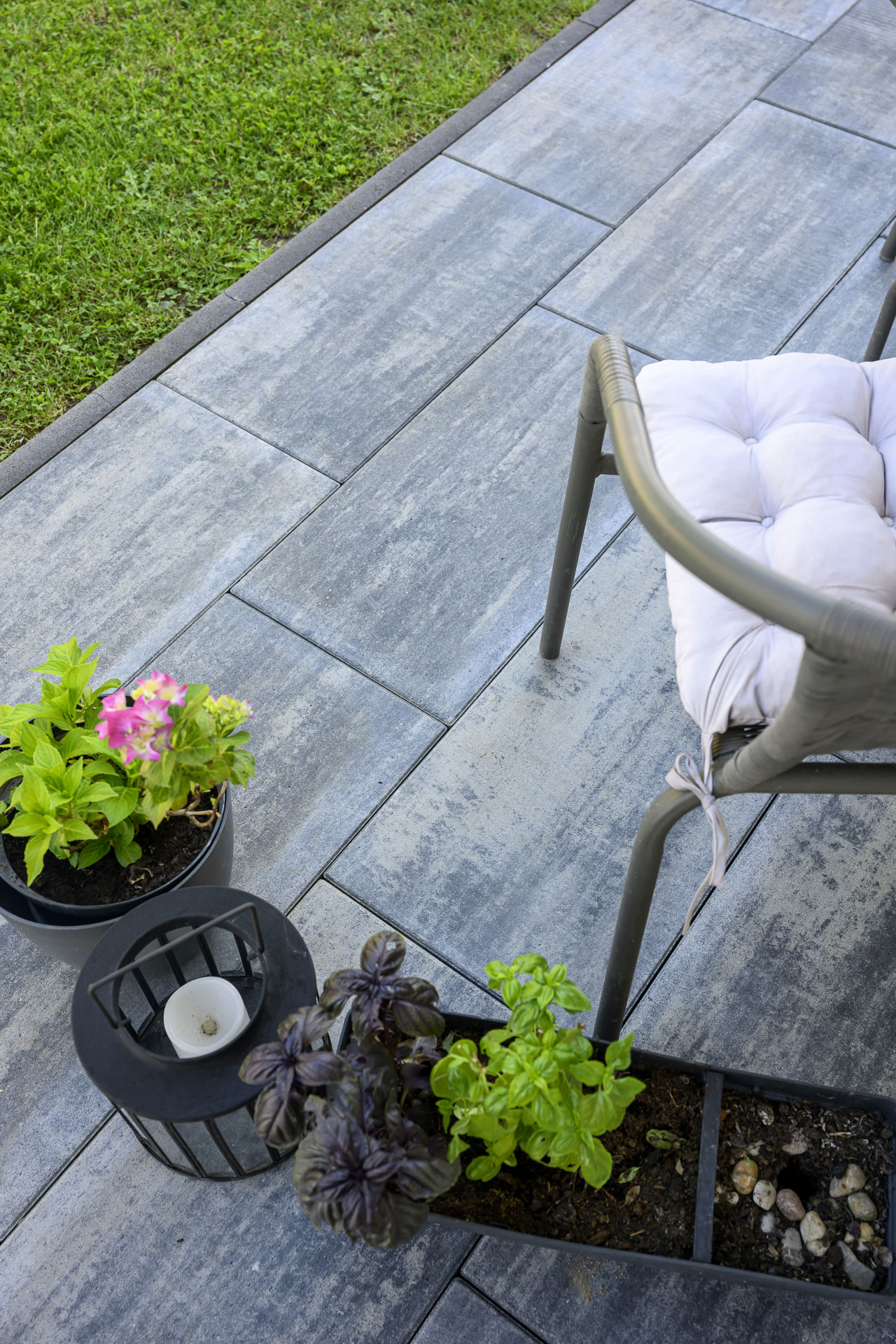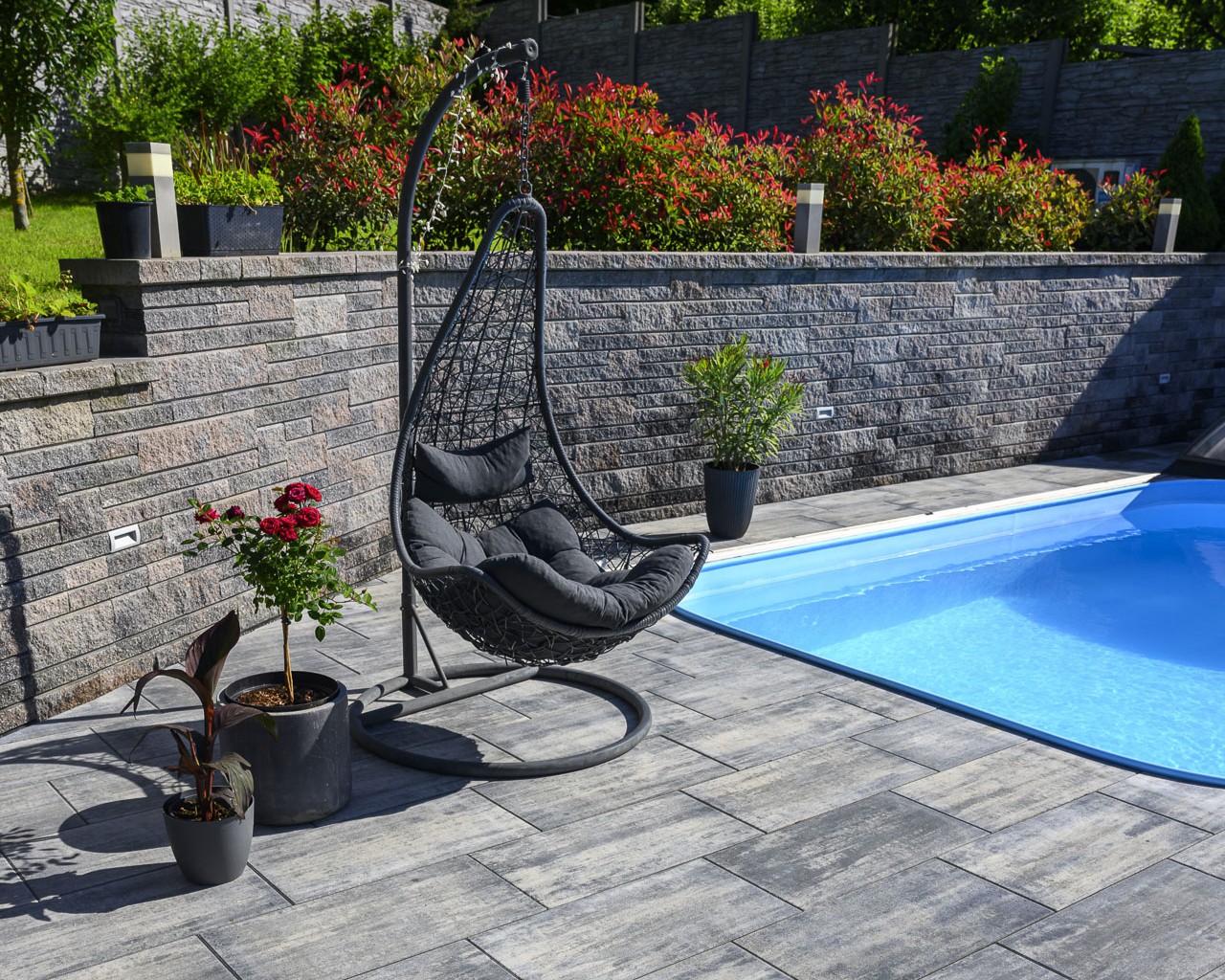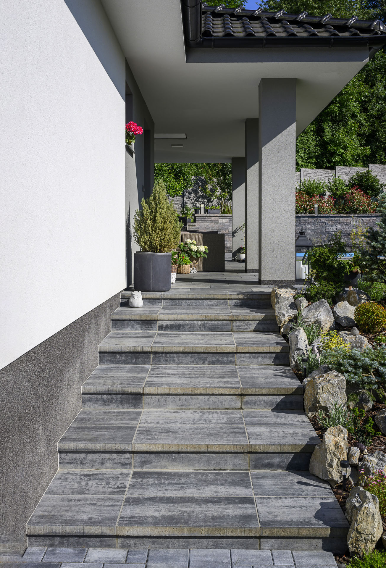 Někdo to rád tón v tónu – dlažby a zdi v okolí tohoto domu respektují a decentně doplňují bílou, šedou a antracitovou barvu celé stavby. Dlažby tvoří kombinace dvou typů – LEGANTO Noarblanc a VIA TECH Noarblanc. Opěrná zeď u bazénu ze systému EDITBLOK doplňuje celou kompozici barvou Basanita.