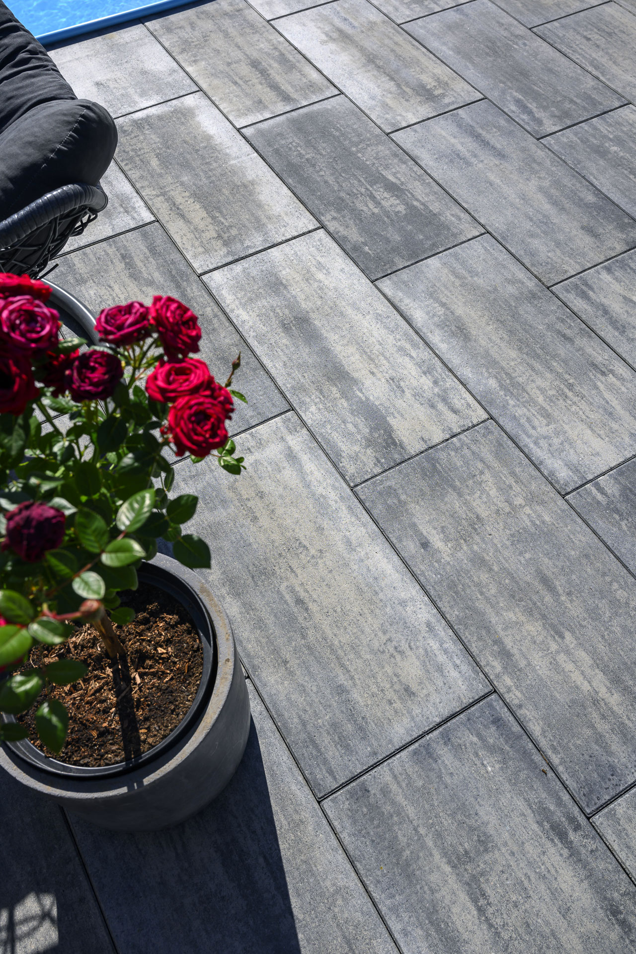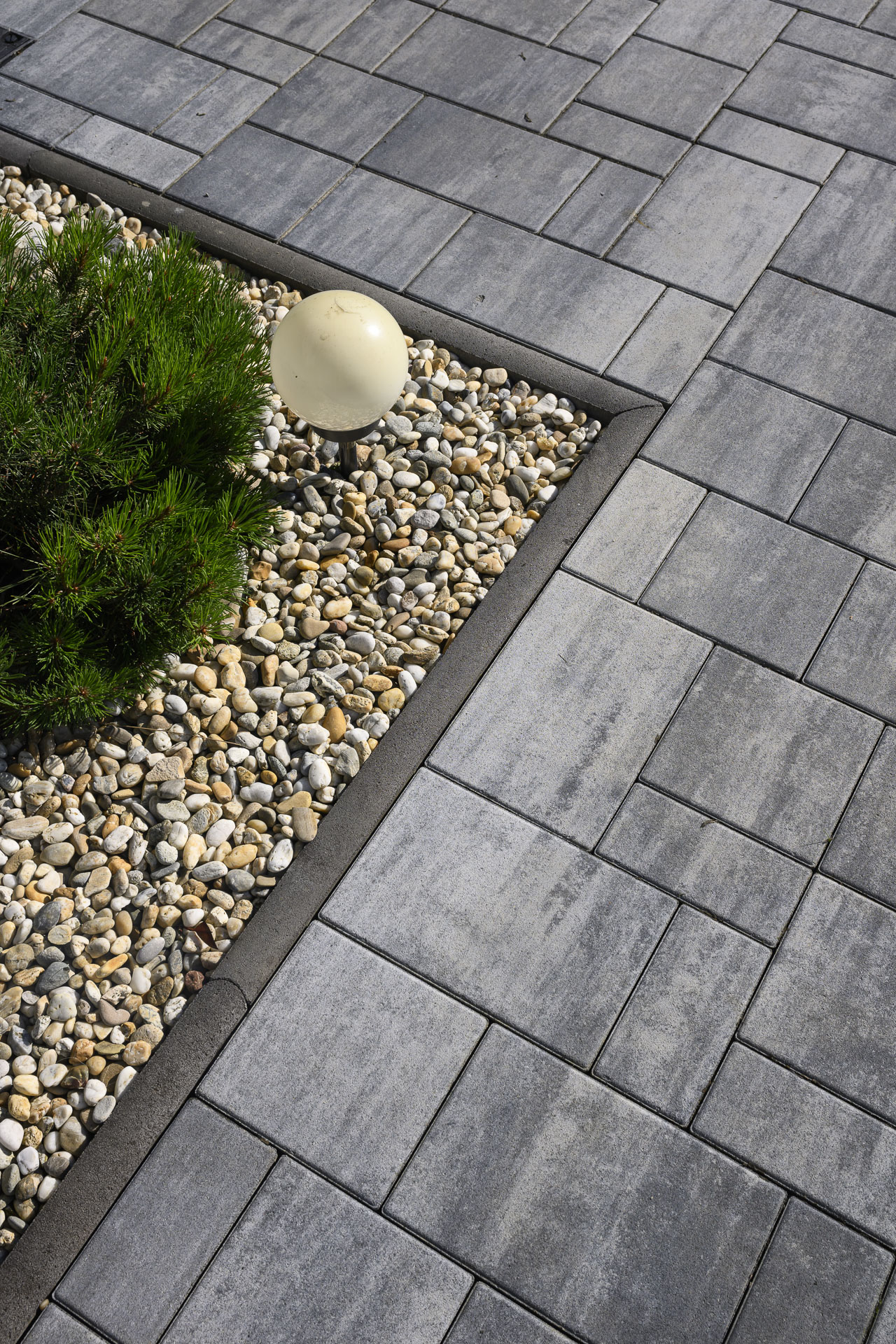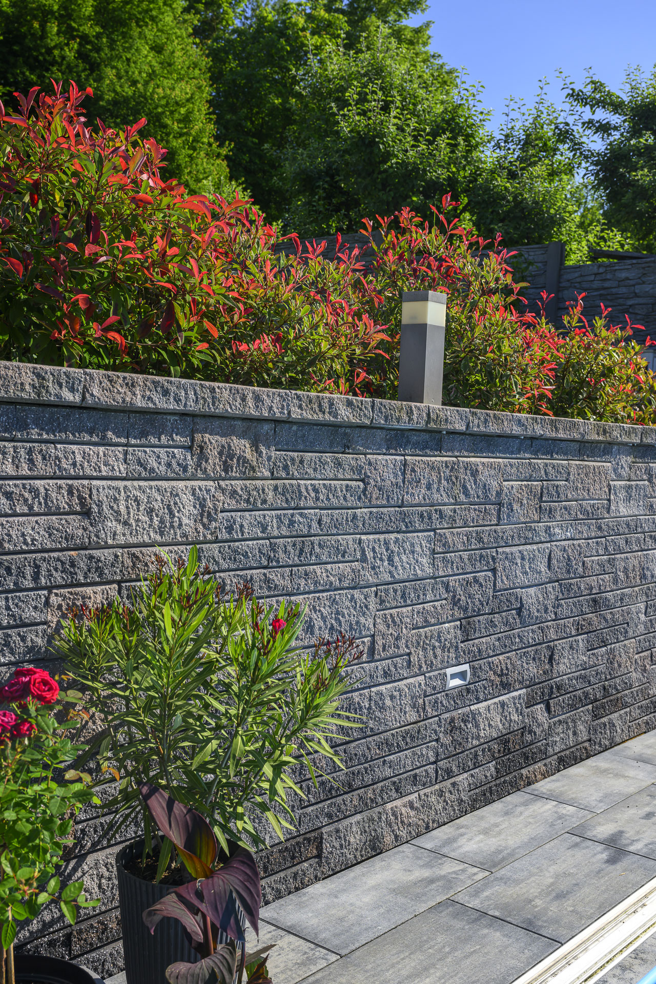 Někdo to rád tón v tónu – dlažby a zdi v okolí tohoto domu respektují a decentně doplňují bílou, šedou a antracitovou barvu celé stavby. Dlažby tvoří kombinace dvou typů – LEGANTO Noarblanc a VIA TECH Noarblanc. Opěrná zeď u bazénu ze systému EDITBLOK doplňuje celou kompozici barvou Basanita.