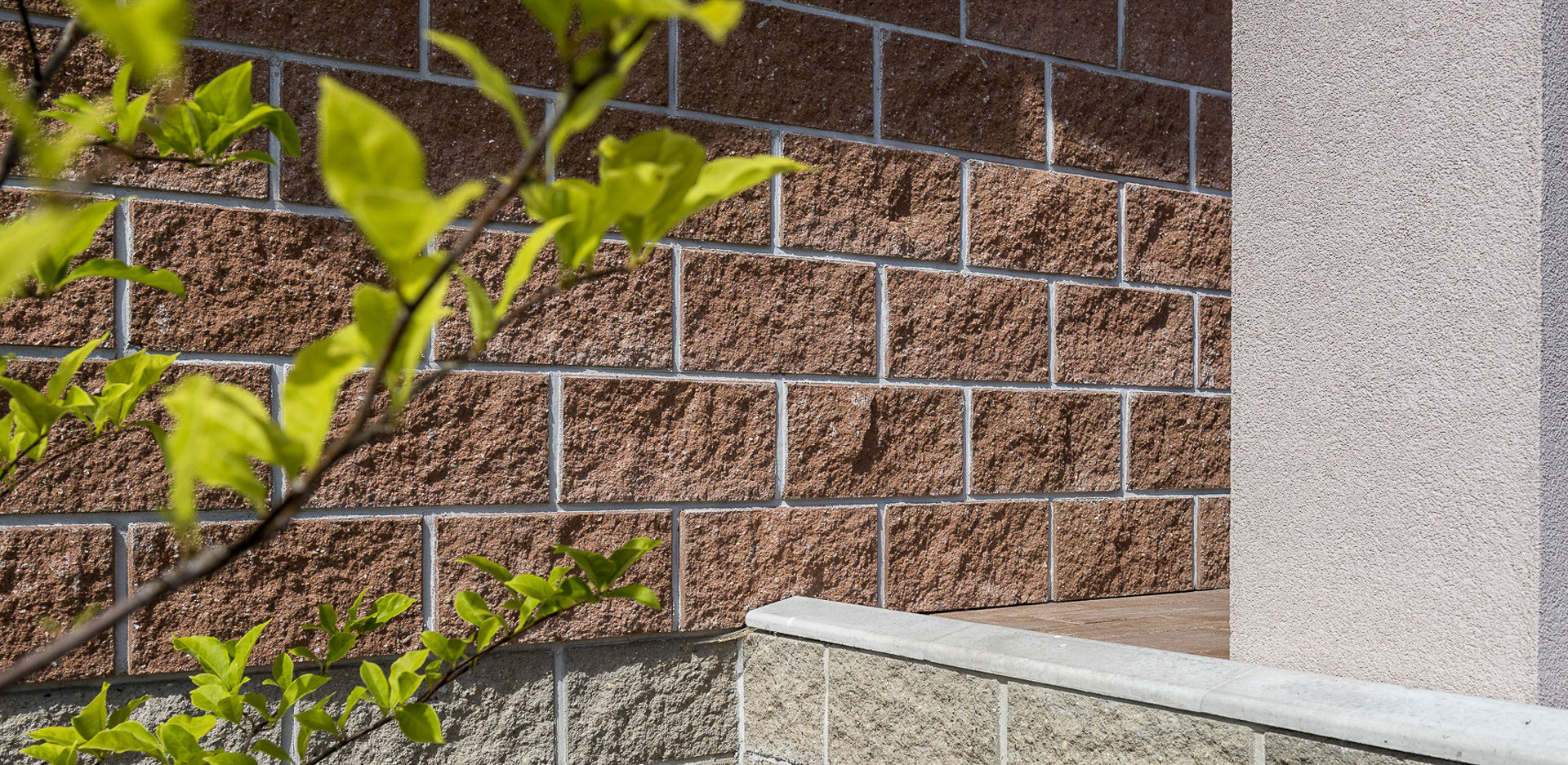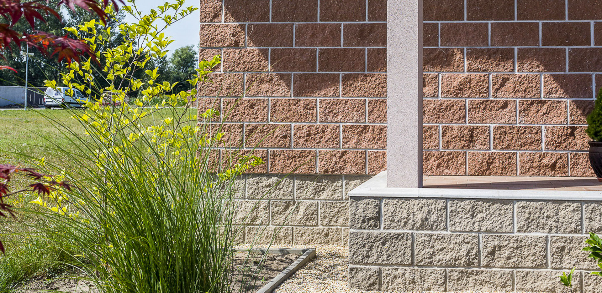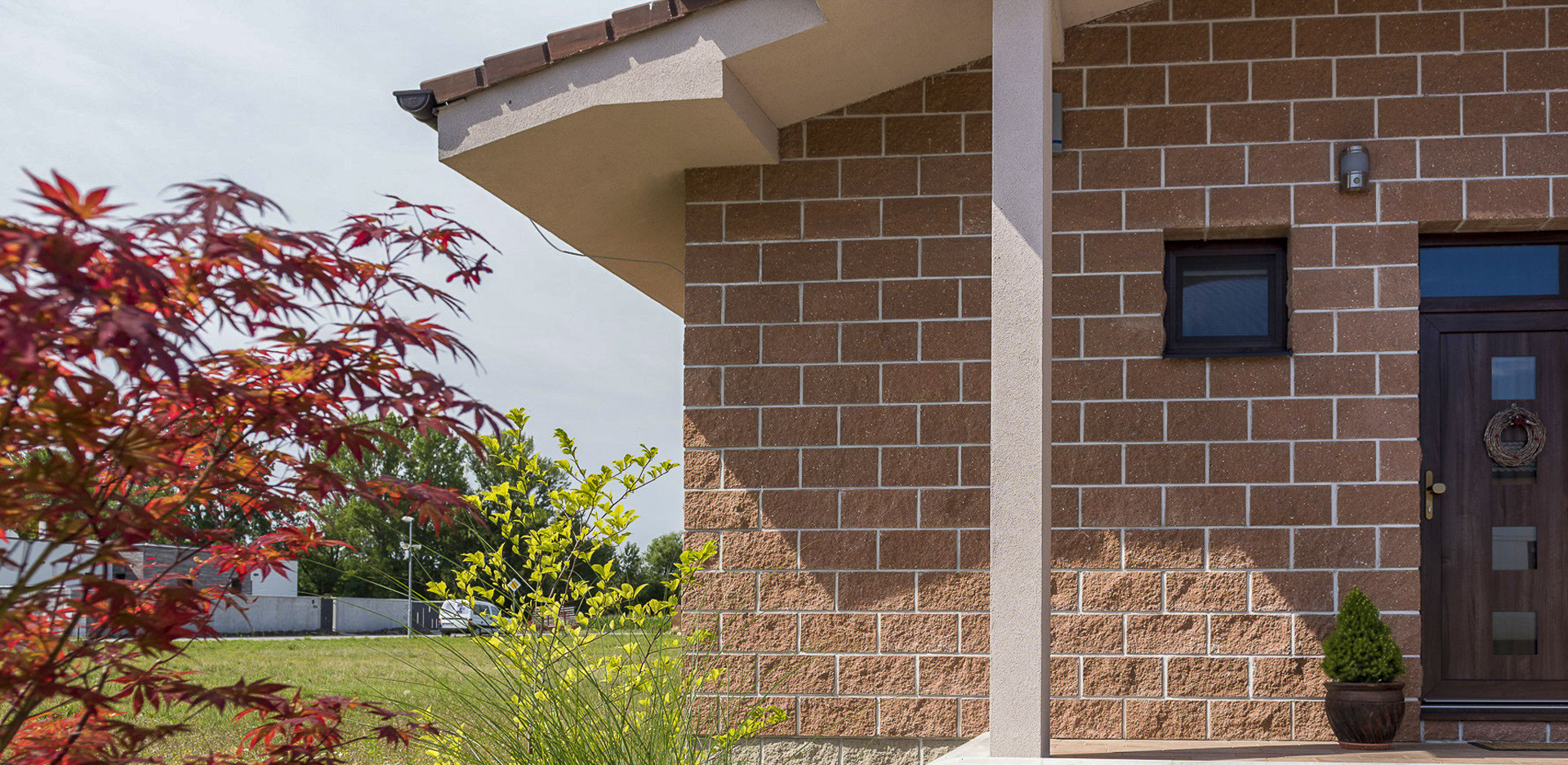 Sendvičový dům s použitými stavebními prvky CSBLOK v barvě JAVOR a ŠEDÁ. Tento klasický systém je použitý také ke stavbě plotu, CSBLOK je univerzální stavební prvek a je určen především na konstrukce plotů a plotových zdí, dělících stěn, okrasných zdí.