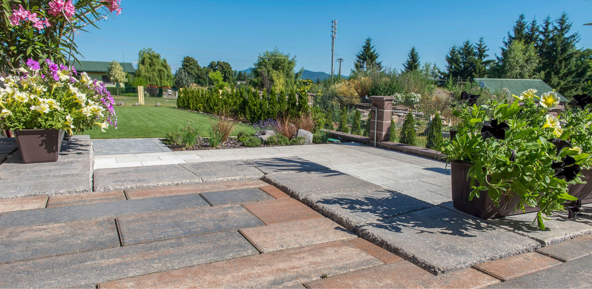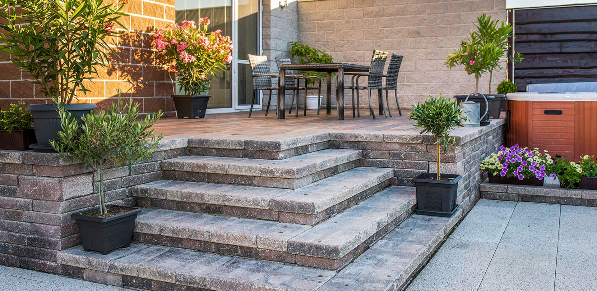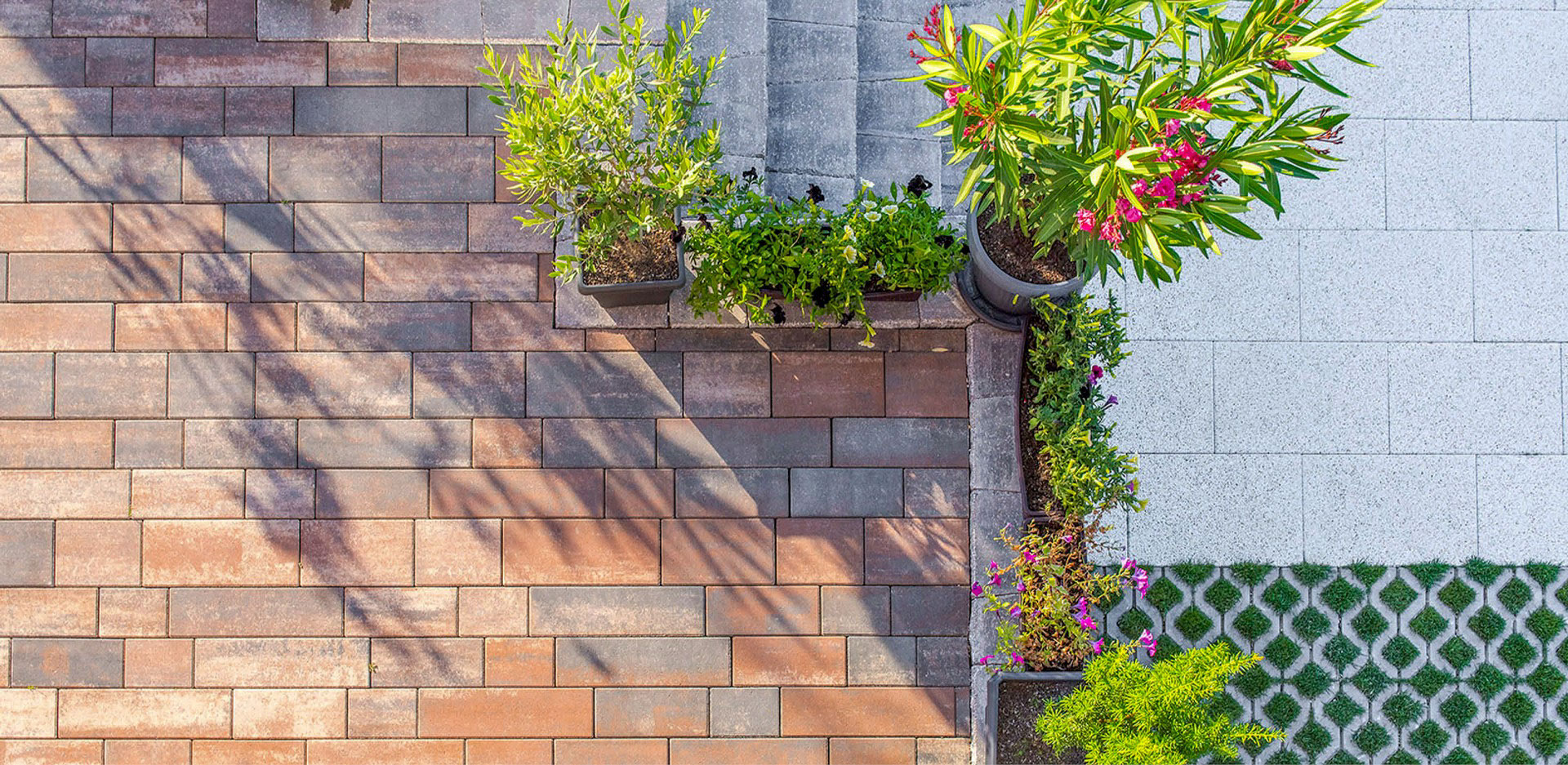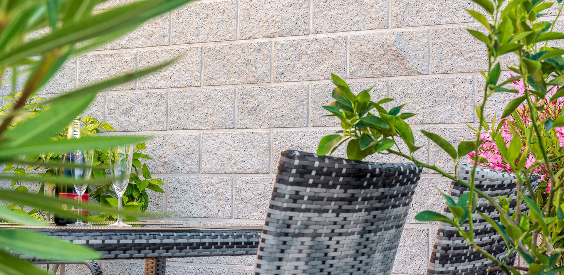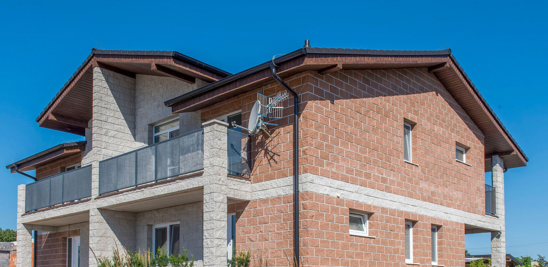 Sendvičový dům s použitými prvky CSBLOK v barvě javor a bílá. Tento klasický stavební systém je použitý také ke stavbě plotu je tedy klasická zdicí štípaná tvárnice s mnoha využitím.