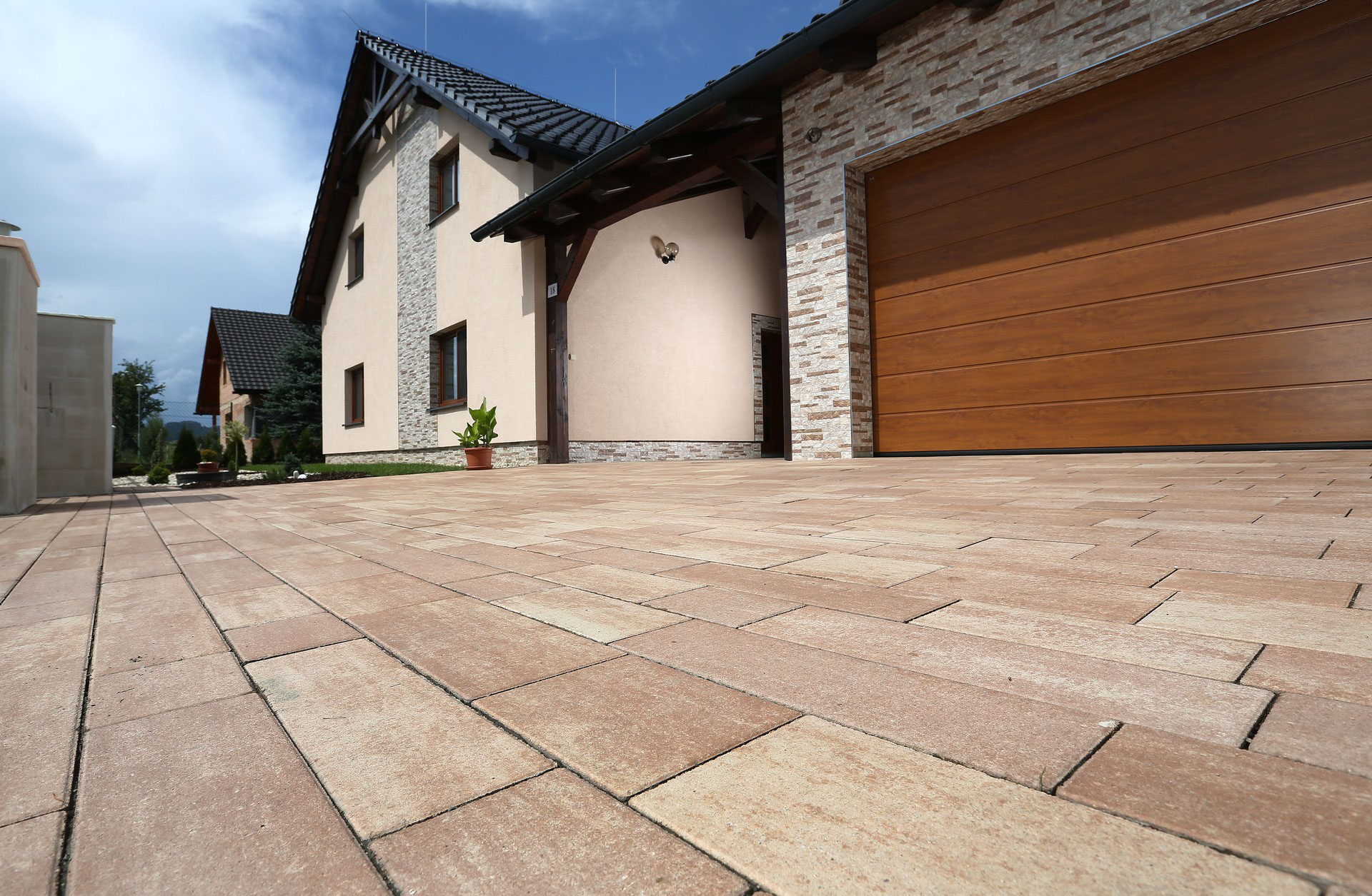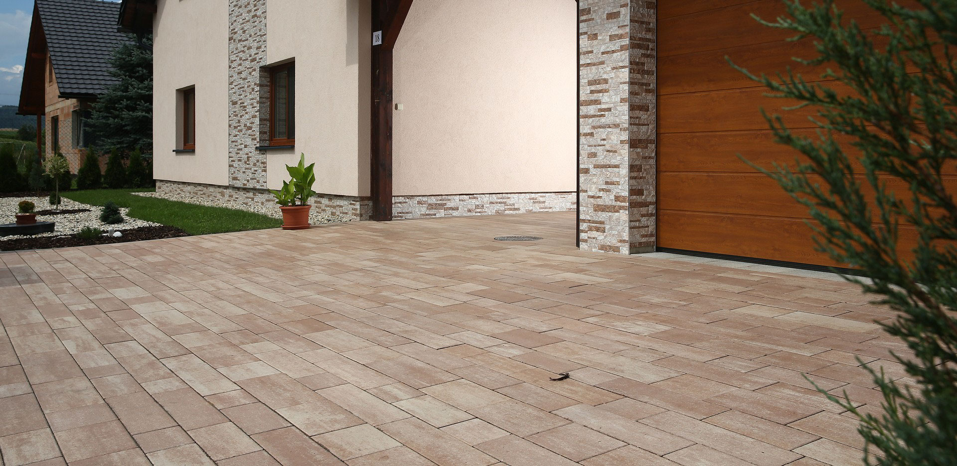 U této novostavby je použita betonová dlažba VALENCIA, která díky podlouhlým tvarům a variabilní skladbě vytváří moderní a harmonický vzhled exteriéru. Je ideální volbou pro chodníky, terasy i okolí domu.