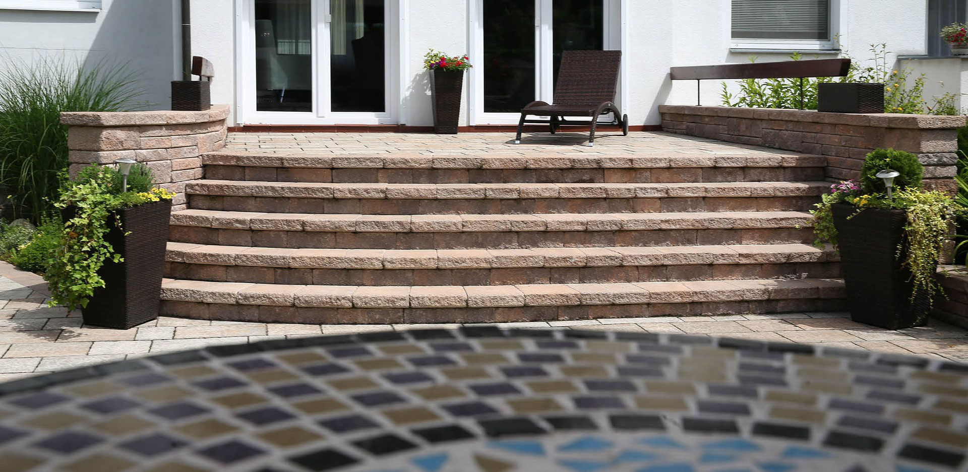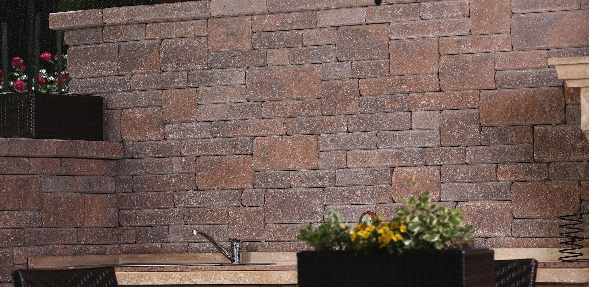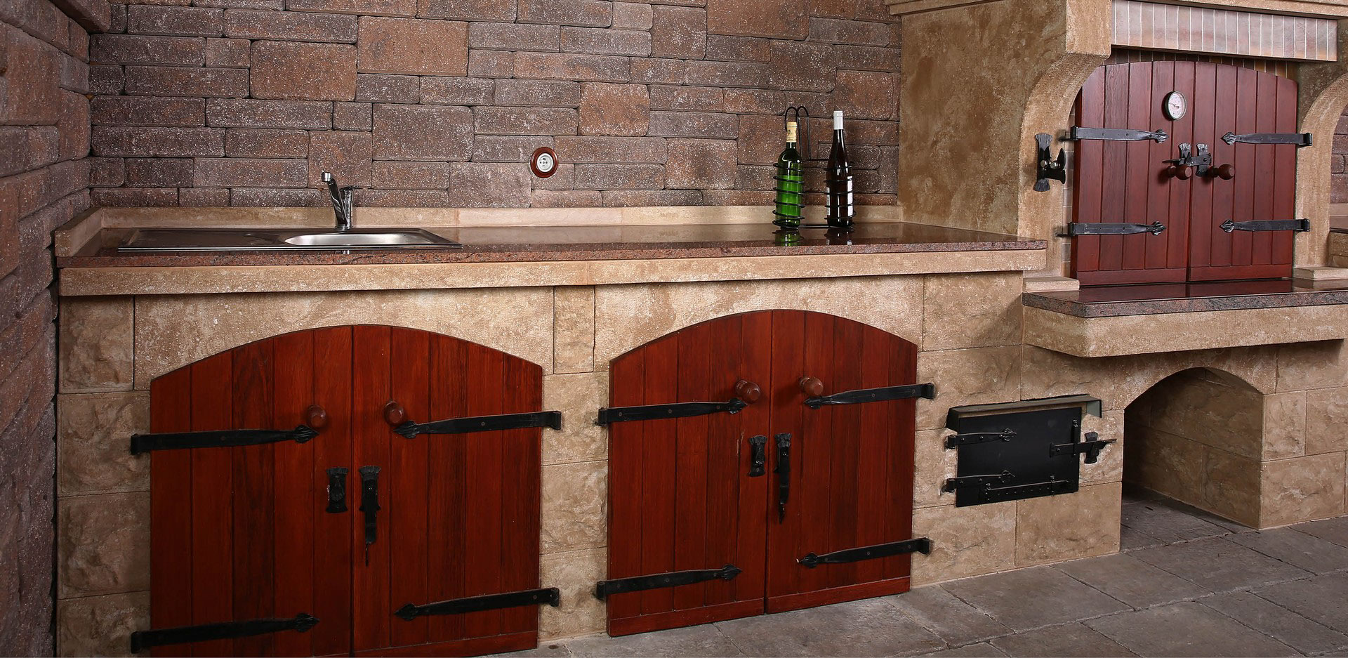 Zahradní kuchyň pro chvíle odpočinku vytvořená z betonového stavebního systému NATURBLOK a lisovaného pískovce jiného dodavatele. Krásné místo pro chvíle s rodinou.